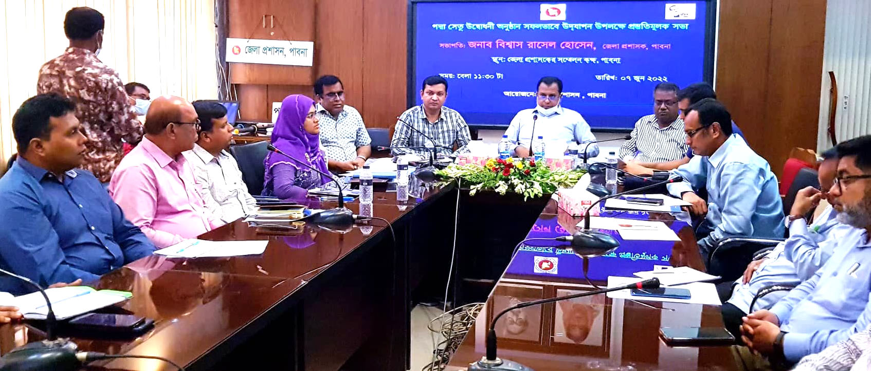 স্টাফ রিপোর্টার ॥ পদ্মাসেতুর উদ্বোধনী অনুষ্ঠানে ভার্চুয়ালী যোগদান নিয়ে পাবনায় অনুষ্ঠিত হয়েছে প্রস্তুতি সভা। গতকাল সকালে জেলা প্রশাসকের সম্মেলন কক্ষে জেলা প্রশাসক বিশ্বাস রাসেল হোসেনের সভাপতিত্বে আয়োজিত এ অনুষ্ঠানে বক্তব্য দেন জেলা পরিষদের প্রধান নির্বাহী কর্মকর্তা কাজী আতিয়ার রহমান, জেলা প্রশাসনের স্থানীয় সরকার বিভাগের উপপরিচালক মোকলেসুর রহমান. অতিরিক্ত জেলা প্রশাসক সার্বিক আফরোজা আক্তার, সিভিল সার্জন ড. মনিসর চৌধুরী,বীর মুক্তিযোদ্ধা হাবিবুর রহমান হাবিব, প্রেসক্লাবের সভাপতি এবিএম ফজলুর রহমান,সড়ক ও জনপদের নির্বাহী প্রকৌশলী মনসুর আহমেদ। সভায় স্থানীয় স্বাধীনতা চত্বর থেকে সেতুর উদ্বোধনী অনুষ্ঠানে যোগদানের সিদ্ধান্ত নেয়া হয়। এ অনুষ্ঠানে জেলার বিভিন্ন দপ্তরের প্রধান, মুক্তিযোদ্ধা, জনপ্রতিনিধি, জেলা আওয়ামীলীগের নেতৃবৃন্দ, সাংবাদিকবৃন্দ ও সুশীল সমাজের প্রতিনিধিরা অংশগ্রহন করেন।