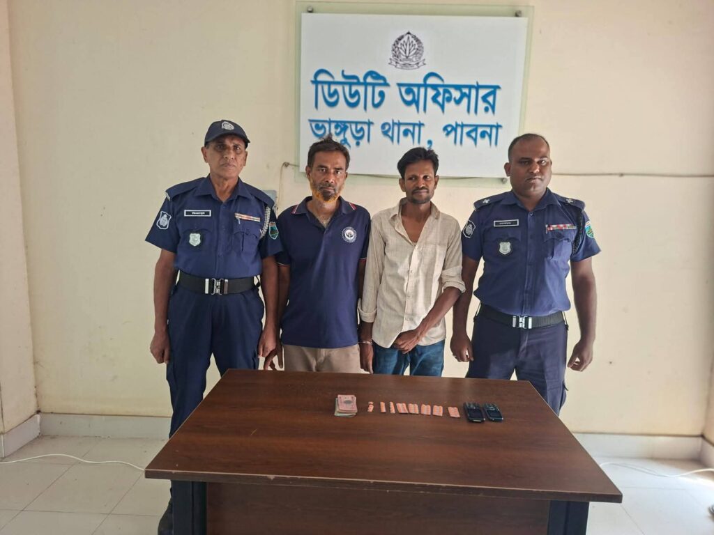 সোমবার (১৩ এপ্রিল ২০২৬) পাবনা জেলার পুলিশ সুপার মহোদয়ের দিকনির্দেশনায় এ অভিযান পরিচালিত হয়। অভিযানের সময় আসামিদের কাছ থেকে মাদক বিক্রয়ের নগদ ১,৪৯৫ টাকা এবং দুটি মোবাইল ফোন জব্দ করা হয়।