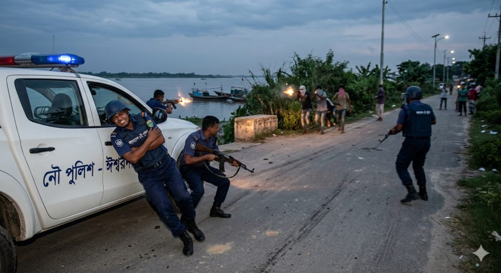 হামলার জবাবে নৌ-পুলিশও পাল্টা গুলি ছুড়লে উভয় পক্ষের মধ্যে তীব্র গোলাগুলির ঘটনা ঘটে। এতে লক্ষীকুন্ডা নৌ ফাঁড়ির ইনচার্জ খন্দকার শফিকুল ইসলামসহ পুলিশ সদস্য ইনামুল হক, শাহিনুর হক, নাজমুল হাসান এবং মানিক মিয়া গুলিবিদ্ধ হন।