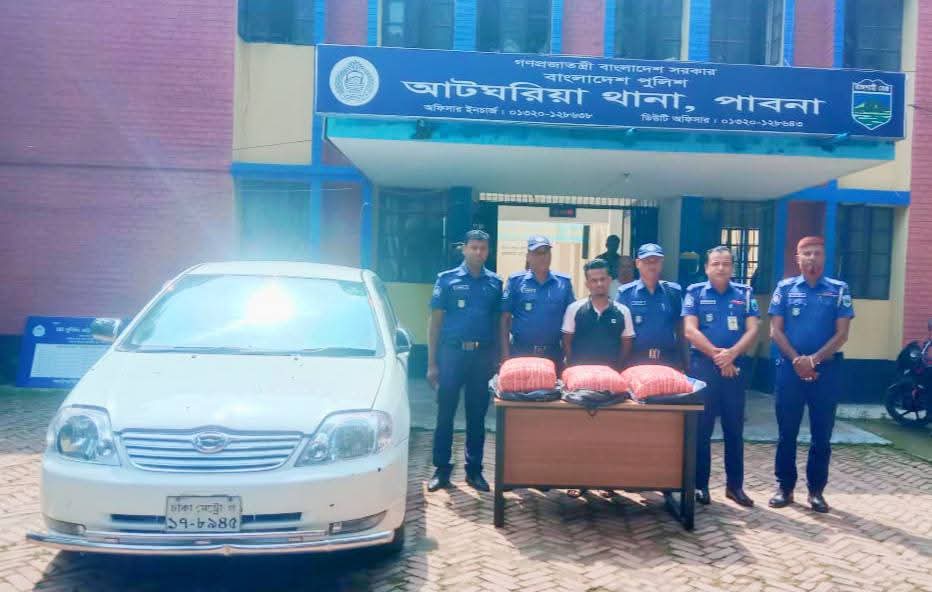 পাবনা জেলার আটঘরিয়া থানাধীন তারাপাশা গ্রামস্থ জনৈক মোঃ আবু মুছা এর বাড়ীর সামনে পাঁকা রাস্তার উপর রাত্রীকালীন আটঘরিয়া থানা পুলিশের চেকপোষ্ট করাকালীন সময়ে ২৩/০৬/২০২৫ রাত্রী ০২.১৫ ঘটিকায় একটি সাদা রংয়ের প্রাইভেট কার দ্রুত গতিতে আসতে দেখে উক্ত প্রাইভেট কার’টি সংকেত দিলে প্রাইভেট কার’টি রাস্তার পাশে দাড়ানো মাত্রই ভিতরে পিছনের সিটে থাকা পলাতক আসামী মোঃ রনি বিশ্বাস (৩৯), পিতা- মেহের বিশ্বাস, সাং- আফুরী, থানা- পাবনা সদর, জেলা- পাবনা কৌশলে পালিয়ে যায় এবং অপর আসামী পালানোর চেষ্টাকালে মোঃ জাহাঙ্গীর হোসেন @ আপন (৩০), পিতা- মৃত আনাই, সাং- জহিরপুর, থানা- পাবনা সদর, জেলা- পাবনা’কে আটক করতে সক্ষম হয়। প্রাইভেট কারটি তল্লাশী করিয়া তিনটি ব্যাগে রক্ষিত সর্বমোট ২৫ (পচিশ) কেজি মাদকদ্রব্য গাঁজা পাওয়া যায়। আটক আসামীর বিরুদ্ধে আটঘরিয়া থানায় মাদকদ্রব্য নিয়ন্ত্রণ আইনে নিয়মিত মামলা রুজু করা হয়েছে। উল্লেখ্য যে, আটক আসামী মোঃ জাহাঙ্গীর হোসেন @ আপন (৩০) এর বিরুদ্ধে বিভিন্ন জেলাসহ পাবনা জেলায় সর্বমোট ০৯ (নয়) টি মাদক মামলা রয়েছে। ধৃত আসামী একজন পেশাদার মাদক ব্যবসায়ী বলে স্থানীয় তদন্তে জানা যায়।