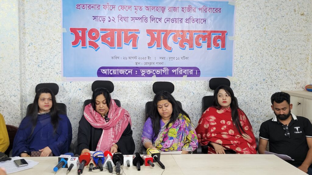 পাবনায় প্রতারণার ফাঁদে ফেলে মৃত আলহাজ্ব রাজা হাজীর পরিবারের সাড়ে ১২ বিঘা জমি আত্মসাতের অভিযোগ উঠেছে।