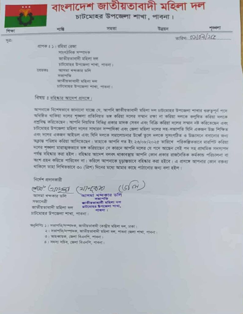বাংলাদেশ জাতীয়তাবাদী মহিলা দলের চাটমোহর উপজেলা শাখার সাংগঠনিক সম্পাদক রহিমা রেজাকে বহিষ্কার করা হয়েছে। গত ১ সেপ্টেম্বর (সোমবার) উপজেলা মহিলা দলের সভাপতি আসমা খন্দকার ডলির স্বাক্ষরিত এক প্রেস বিজ্ঞপ্তিতে এ তথ্য নিশ্চিত করা হয়।