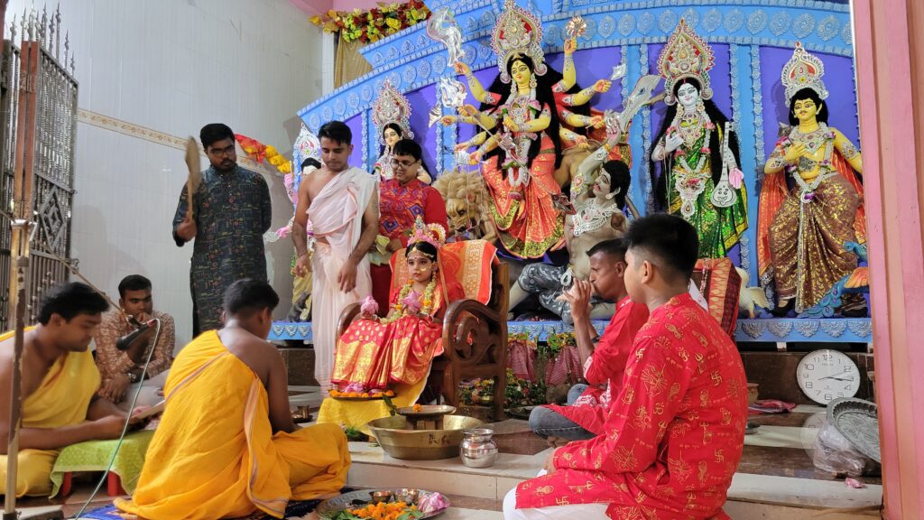 পূজা উপলক্ষে সকাল থেকেই ভক্ত-দর্শনার্থীরা সেবাশ্রম প্রাঙ্গণে সমবেত হতে থাকেন। ধর্মীয় নিয়ম অনুযায়ী, অল্পবয়সী এক কন্যাশিশুকে দেবী দুর্গার প্রতীক হিসেবে সজ্জিত করা হয় এবং তাকে দেবীর আসনে বসিয়ে পূজা করা হয়। পুরোহিতদের মন্ত্রোচ্চারণ, শঙ্খধ্বনি ও ধূপ-ধুনোর গন্ধে মন্দির প্রাঙ্গণ মুখরিত হয়ে ওঠে।