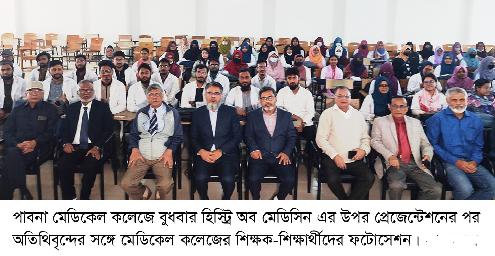 পাবনা মেডিকেল কলেজে বুধবার হিস্ট্রি অব মেডিসিনের উপর গুরুত্বপুর্ণ প্রেজেন্টেশন অনুষ্ঠিত হয়। মেডিকেল কলেজ শিক্ষক সমিতি আয়োজিত এই অনুষ্ঠানে চিকিৎসা শাস্ত্রের শুরু থেকে বর্তমান সময় পর্যন্ত গুরুত্বপুর্ণ প্রেজেন্টেশন উপস্থান করেন আর্মস ফোর্সেস মেডিকেল সার্ভিসেস’র সাবেক মহাপরিচালক ও দেশের বিশিস্ট মেডিসিন বিশেষজ্ঞ মেজর জেনারেল(অব.) ডা. রবিউল হোসেন। এসময় পাবনা কালেক্টরেট পাবলিক স্কুল এন্ড কলেজের অধ্যক্ষ প্রফেসর শিবজিত নাগ, ক্যাপ্টেন(অব.)কামরুল হোসেন, ডা. ক্যাপ্টেন(অব.)আনিসুর রহমান, পাবনা প্রেসক্লাবের সভাপতি আখতারুজ্জামান আখতার, পাবনা মেডিকেল কলেজের মেডিসিন বিভাগের প্রধান অধ্যাপক ডা. এএম শাফিকুল হাসান, চক্ষু বিভাগের অধ্যাপক আমিনুর রশিদ আকন্দ, পাবনা মানসিক হাসপাতালের পরিচালক ডা. শাফকাত ওয়াহিদ, পাবনা মেডিকেল কলেজের এনেস্থেসিওলজি বিভাগের সহযোগী অধ্যাপক সিরাজুল ইসলাম শুভ, পাবনা মেডিকেল কলেজ শিক্ষক সমিতির সভাপতি ডা. মাসুদুর রহমান প্রিন্স প্রমুখ উপস্থি ছিলেন।