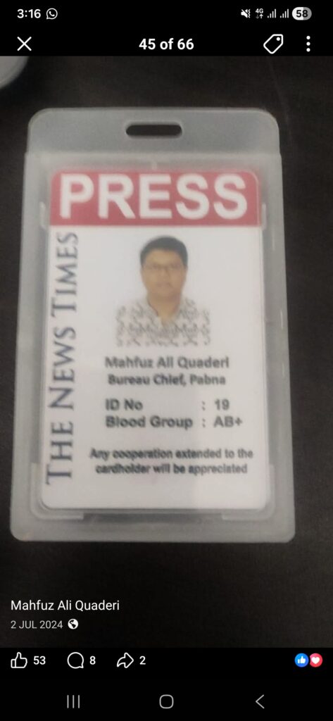 বাংলাদেশ মফস্বল সাংবাদিক ইউনিয়নের পাবনা জেলা শাখার সেক্রেটারি, সংবাদপত্র মালিক গ্রুপের সদস্য ও সমাজসেবক মাহফুজ আলী কাদেরীকে ডিবি পুলিশের একটি টিম পুলিশ সুপারের সঙ্গে আলাপের কথা বলে পাবনা পুলিশ সুপার কার্যালয়ে ডেকে নিয়ে কোনো মামলা বা আইনগত প্রক্রিয়া ছাড়াই পরিকল্পিতভাবে হয়রানিমূলক ও মিথ্যা মামলায় জড়ানোর ঘটনায় তীব্র নিন্দা ও গভীর উদ্বেগ প্রকাশ করেছে সাংবাদিক সমাজ।